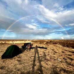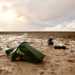 Am Morgen nach dem Frühstück gestartet. Nach 10 km kommt ein Restaurant. Die LKW-Fahrer trinken auch hier schon am Morgen Wodka. Ich fahre weiter und biege von der Hauptstraße ab, um ein Dorf zu erreichen. Dort gibt es eine Einkaufsmöglichkeit. Weiter auf der Straße und es fängt an zu regnen. Leider hört es nicht mehr auf und ich denke, es wäre jetzt gut einen Platz zum schlafen zu finden. Ich verlasse die Straße und komme keine 50 m weit. Es ist totaler Matsch. Das Hinterrad am Fahrrad blockiert. Die Kette spannt sich durch den Dreck so stark, dass ich Angst hatte, es würde etwas kaputt gehen. Zum Glück hatte ich genügend Wasser dabei, so dass ich die Kette und die Ritzel gut reinigen konnte. Als ich auf der Straße zurück war, schien plötzlich wieder die Sonne. Nach ungefähr 10 km sah ich auf einer kleinen Anhöhe ein Haus. Ich dachte, ich könnte dahinter mein Zelt für die Nacht aufschlagen. Der Weg dorthin sah gar nicht so schlecht aus, aber es war trügerisch. Nach etwa 100 m war kein weiterkommen und zurück auf die Straße war extrem mühsam, da das Hinterrad immer wieder blockierte und die Kette wieder so straff war, dass ich Angst hatte sie könnte reißen. Zentimeterdicker Schlamm unter meinen Fußsohlen. Extrem rutschig und so bin ich dann auch noch ausgerutscht und lag der Länge lang im Schlamm. Wieder die Kette und Ritzel gereinigt und noch eine Flasche Wasser dabei verbraucht. Ich überlegte, ob ich vielleicht gleich bis in die nächste Stadt fahren sollte, um mir ein Hotel zu nehmen, weil es im Moment aussichtslos schien, bei dem Schlamm und Matsch einen Übernachtungsplatz neben der Straße zu finden. Allerdings war es noch ziemlich weit und ich hatte Sorge, dass ich vielleicht so wie ich aussah, abgewiesen werden könnte. Kurze Zeit später kam ein Flusslauf, dort sah ich gute Möglichkeiten für ein Camping. Unten am Fluss war der Boden auch sandig, so dass ich nicht mehr im Matsch versunken bin. Ich wollte gerade mein Zelt auf stellen, da fing es plötzlich an, wie aus Eimern zu schütten. Dort, wo ich mein Zelt ausgebreitet hatte, bildet sie sich innerhalb von sehr kurzer Zeit eine riesige Pfütze und das Zelt war komplett im Wasser und alles war nass. Der Vorteil war, dass der Schlamm an meiner Regenbekleidung etwas abgewaschen wurde. Kurze Zeit darauf wieder Sonnenschein. Ich nahm das Innenzelt und die Fußmatte raus versuchte alles etwas zu trocknen. Keine Chance. Es war aber dann doch nicht so schlimm, weil meine ISO Matte noch trocken geblieben war.Read more
