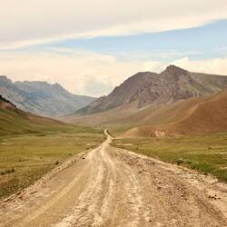 Weiter geht es Richtung Song Kol. Es gibt nur steile Pisten. Mit dem schweren Reiserad komme ich nur langsam voran.