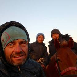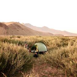 Gerade habe ich einen Platz in den Büschen für mein Zelt gefunden. Es ist extrem windig. Das Klima auf der anderen Seite vom Taldyk Pass ist ein anderes. Ich bleibe aber nicht lange unentdeckt. Zwei Youngsters kommen mit ihren Pferden und sind ein bisschen neugierig. Beim ersten Mal ein bisschen schüchtern. Nach etwa einer halben Stunde kommen sie wieder, dann wollen sie Selfies machen und mit meinem Fahrrad fahren. Das geht natürlich nicht, ich hätte im Gegenzug einmal auf einem ihrer Pferde reiten dürfen.