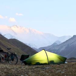 Am Morgen mache ich die kleine Wanderung zum Pik Lenin Basecamp. Danach suche ich einen Platz am See für mein Zelt und genieße die Ruhe in den Bergen.