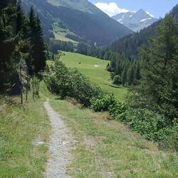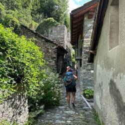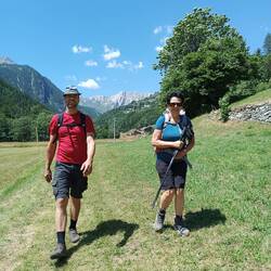 Heute gab es ein süßes Frühstück (das mag ich nicht) und wir sind gemütlich zu zweit um neun los. Keine steilen Abstiege wie befürchtet, sondern stetig bergrunter durch Wiesen und über angenehme Pfade. Nach einer Stunde stießen wir auf Esther und liefen zusammen bis St Rhemy, wo wir ein Bierchen tranken. In Etroubles haben wir bei einer älteren Frau Mittagessen gegessen, Melone mit Schinken, Weißwein und Pasta, perfekt, um Energie zu tanken und die letzten 2km bis Echevennoz zu gehen. Insgesamt waren es 15km und 1300hm herunter. Hier, auf der italienischen Seite, ist es auf der Höhe natürlich deutlich heißer. Mit meinen Blasen ist es vorbei, die neue Herausforderung heißt Hitze.