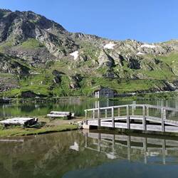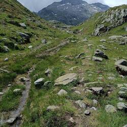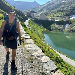 Langsam und stetig ging es bergauf. Leider war ein Ultra-Marathon zur gleichen Zeit und der Weg aber sehr schmal, so dass wir Wanderer dauernd stoppen und auf die Seite stehen mussten-nervig, wenn man bergauf geht. Und es kamen mehrere Hundert Läufer. Hier war es, als ich schneller lief als die beiden und wir uns erst auf dem Pass wieder trafen. Als der Weg von den Läufern weg abzweigte, mache ich drei Kreuze und war gut gelaunt und entspannt. Und ich fühlte mich das erste Mal seit sieben Tagen gut, ich fühlte mich stark und fit und war auch schnell oben. Nach zwei Bier traf Vale ein und kurze Zeit später Margrit und Esther. Sie standen noch mit einem verletzten Läufer, bis der Heli kam. Ich hatte vor dem Abendessen mit Vale noch Zeit, auf die andere Seite des Sees zu gehen und ein Bier zu trinken. Für mich war das die schönste Tour bisher, auch landschaftlich.