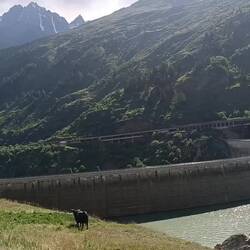 Heute morgen haben wir zusammen gefrühstückt und es war ein super Einstieg für den Aufstieg. Eine Sache war aber anders: meine Füße, meine Hüfte schmerzten nicht gleich zu Anfang und nur ein kleines Ziepen der Blasen. Mal abwarten, was nach paar Kilometern passiert. Die Landschaft wurde indes immer schöner, bald kamen wir an den Stauseen und tranken dort einen Kaffee. Witzig war, dass Margrit, kurz bevor wir direkt an den schwarzen Kühen vorbei gehen mussten, sagte, diese Rasse, die Eringer, seien etwas aggressiv. Aber die Bauern waren dabei, so blieben sie ruhig.