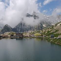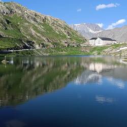 Hier auf dem Gran Bernadino Pass ist das Hospiz aus dem 12.Jh., gegründet und bis heute von den Augustiner Chorherren geführt. Schon die Römer haben hier einen Tempel gebaut und der Pass war noch zu Zeiten von Napoleon 1800 ein wichtiger Alpenübergang. Die Bernhardiner Hunde wurden seit dem 17. Jh. bis heute hier oben gezüchtet, heute mehr als soziale Tiere, früher als Lawinenhunde.