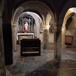 Die Abtei der Augustiner Chorherren ist sehr besonders, da es das einzige Kloster überhaupt ist, das ununterbrochen seit 1500 Jahren besteht. Die Reliquien der Märtyrer wurden im 4. Jh. hier nach römisch "Agaunum" gebracht und sind seit dem 12.Jh. in dem vergoldeten Reliquienschrein enthalten. Über viele Jahrhunderte bzw. seit über einem Jahrtausend sind hier Pilger auf dem Weg nach Rom hergeströmt, um dem Hl . Mauritius zu huldigen. Man kann heute noch alle Bauphasen der verschiedenen Kirchenbauten erkennen, auch die Krypta zur Verehrung der Reliquien des Hl Mauritius ist noch erhalten. Der Klosterschatz ist entsprechend wertvoll, mit Stücken aus dem 1.Jh.v.Chr, aufwendigen Email -und Silber-und Goldverzierungstechniken.