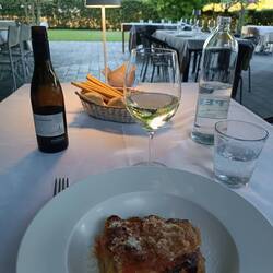 Auch hier Risotto. Ich habe einen geräucherten Scamorza mit Tomatensauce gegessen. Auch Bandnudeln mit Wildfleisch gab es. Und leckere Fleischspieße, spiadine.