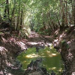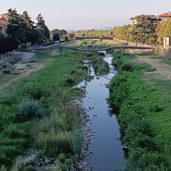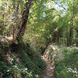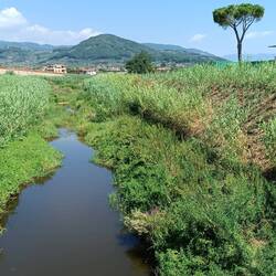 Mehrere Kilometer durch diesen und zwei daran angrenzende Städte, immer wieder waren Hügel hochzulaufen. Wasserspender gab es gehäuft an einem Ort kurz hintereinander und dann lange gar nicht. Ich füllte meine Flasche immer auf, hatte aber großen Durst und konnte nicht immer so viel trinken wie ich gerne hätte, da ich nie wusste, wann ich wieder eine Quelle haben werde. Nachdem ich diese dritte Stadt verlassen hatte, ging der Weg auf einem 7 Meter hohen Grat zwischen Fluss und Feldern durch Pfahlrohr. Als Kind hätte ich das lustig gefunden, aber in der Hitze mit dem Rucksack überhaupt nicht. Und die Strecke war 1,5 km lang, ich musste mich Stück für Stück hindurch kämpfen, es war alles zugewachsen, ich verletzte mich am Anfang und musste danach auf die aus dem Boden abgebrochenen, harten Pfahlrohre achten. Der Weg ging danach sehr anstrengend über eine Straße an der Autobahn entlang, mal rechts und mal links, immer in der Sonne. Ich war froh, als ich die Autobahn hinter mir ließ und dann gab es wieder einen Aufstieg zu einer Burgruine. Danach über Wälder und Pfade viel auf und ab, immer wenn ich dachte, es wäre der letzte Aufstieg, gab es noch einen und noch einen, zuletzt hatte ich weder Wasser noch was zu essen und ich war sehr erschöpft von Hunger, Durst, der schwülen Hitze, die sich durch den Regenguss über den angrenzenden Bergen noch verschlimmert hatte. Kurz: auch wenn es nicht die längste aber mit 35km eine ausreichend lange Tour mit vielen Aufstiegen war, für mich war sie die Anstrengendste. Auch waren die letzten Nächte so heiß und mückenreich, dass ich auch einen gewissen Schlafmangel habe. Unterwegs gab es nichts zu essen oder zu trinken, so dass ich, erst als ich schon über 2km in Pistoia kurz vor fünf Uhr eingelaufen war, ein offenes Restaurant fand. Denn es ist heute hier Feiertag und vieles hat zu oder in Betriebsferien.