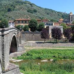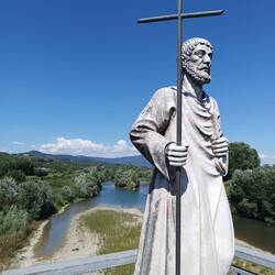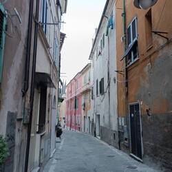 Heute morgen ging es schnell über den Fluss raus aus der Stadt den Berg herauf in den Wald. Lange und stetig berghoch, ich nahm mir aber die Zeit. Später war da noch ein Örtchen auf dem Berg mit einer Ruine, die ich mir auch noch anschaute, um einen fantastischen Blick über die Umgebung zu bekommen. Auch hier habe ich sehr lange für die ersten 10km gebraucht. Man konnte von hier oben das erste Mal das Meer erblicken! Dann ging ich zu dem letzten Ort in den Bergen und machte dort die Runde einmal um das Dorf herum, eine Panoramaumrundung. Ich nahm dann leider den Talweg statt den eigentlichen Weg, ich hatte aber keine Lust unten an der Straße entlang zu laufen. Also versuchte ich quer einen anderen Weg zu laufen, um wieder auf den Bergweg zu kommen und kam in der richtigen Richtung an. Der Fahrradweg führte unten in die Stadt, wie ich dachte, an der Straße entlang. Ich stieg an einer anderen Stelle wieder den Berg hinauf, um an den richtigen Weg anzuschließen. Nur kurz folgte ich ihm, da er wieder hinunter führte. Kurze Zeit später bemerkte ich, dass es unten einen Fußweg am Fluss gab, den ich hätte, einmal unten, entspannt folgen können. Zusätzliche Kilometer, zusätzliche Höhenmeter, Fehlentscheidungen noch und nöcher. So kam es, dass ich erst um halb zwei ankam. Ich entschied zunächst essen zu gehen, also in die Stadt, die Herberge war etwas außerhalb. Ich wusste nicht, wann diese aufmacht und wollte noch Mittagessen gehen. Focaccia scheint hier die Spezialität zu sein und ich entschied mich dafür und gegen die Ravioli - wieder die falsche Entscheidung, wie sich später herausstellen sollte. Mit Gedeck 2€, Bier 7€ und Kaffee 2€ lag ich mit dem kleinen Imbiss bei 18€. In der Herberge war niemand, ich erreichte keinen. Also trank ich mein Aperol Spritz in der Bar nebenan und aß noch ein Eis-was ich selten tue. Erst um kurz nach vier sah ich einen weiteren Pilger, der meinte,es käme wohl gleich jemand. Ein weiterer Pilger kam und später noch einer. Linus ist von England, Canterbury gestartet, läuft also den kompletten Weg nach Rom. Mit Zelt, ohne Geld, sehr beeindruckend, der junge 23-jährige Engländer! Nur zweimal hatte er nichts zu essen und wurde sonst viel eingeladen. Und der Franzose hat auch ein Zelt. Zu viert sind wir in die Stadt, da war mächtig was los, da Künstlermarkt war. In dem Pub gab es nur Focaccia. Also zweimal Focaccia. Sehr netter Abend mit sehr interessanten Leuten, mit denen ich gleich einen guten Draht hatte.Lue lisää