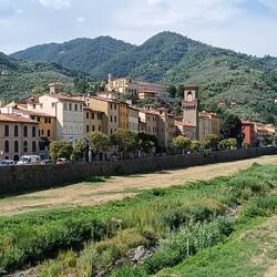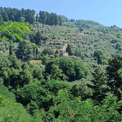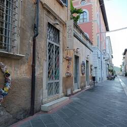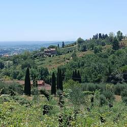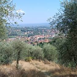 Heute morgen gab es an diesem fantastischen Ort selbstgemachte Marmelade, Joghurt (ah,Joghurt!) und Obst, was man sich auch mitnehmen konnte (was sehr wichtig war, wie sich später ergab). Sehr gerne war ich hier. Kurz nach sieben stieg ich nach Pescia runter, was schon über 3km sind, die Kathedrale war natürlich noch zu, und es ging den ersten langen Anstieg hoch zu einem Dorf. Es war nicht einmal neun Uhr, und mir tropfte der Schweiß von der Stirn herunter. Ich erinnere mich nicht mehr daran, wann ich das letzte Mal so geschwitzt hätte, außer in der Sauna. Der ganze Tag war fürchterlich heiß und sehr schwül. Das machte zusätzlich sehr viel Mühe. Insgesamt drei von den schönen toskanischen Bergdörfern mußte ich erklimmen, rauf und runter, bisschen verlaufen und zusätzliche Kilometer und Höhenmeter... Bis ich im großen Kurort Montecatini Terme ankam, waren vier Stunden vergangen und ich war nicht Mal bei Kilometer 10, nicht mitgezählt der Abstieg von der Herberge. Ich trank Kaffee und lief lange durch die touristische Stadt. Auch hier verlief ich mich trotz GPS track, die Wegzeichen sind in einem großen Ort sowieso sehr schwer zu finden.