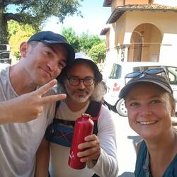 Um sieben ging ich Kaffee und Croissant frühstücken und mit der Idee, nur knapp 19km zu laufen los. Viel Asphalt und es war sehr früh sehr heiß. Durch den Wald über Bambus und dunkle Lössgassen bergauf. Nach dem zweiten langen Aufstieg war ich in dem Ort, in dem ich übernachten wollte, Valpromaro. Ich hatte nicht reserviert und es sah zwar nett aus, aber ich entschied vorher schon nach Lucca zu laufen und so suchte ich die Bar auf, dort gab es nur Panini und Mikrowellenpasta und ich aß Panini und trank Bier. Es gab noch eine letzte Steigung von insgesamt drei Steigungen. Danach ging es eine lange Straße entlang und ich sah Giovanni, den Italiener und Pietro. Und wir gingen die letzten acht Kilometer zusammen. Ich hatte sie eingeholt, waren sie doch von Cammaiore los gelaufen. Am Ende waren es 40km und der Bierdurst war groß. Wir kamen an einem der Hauptplätze an und Massimiliano kam auch noch dazu. Eine wahre Freude den Abend mit allen zu verbringen, ehe unsere Wege auch wieder trennten. Abends waren wir noch zusammen essen. Morgens habe ich noch mit Pietro gefrühstückt und hab mich nochmal schlafen gelegt.Lue lisää