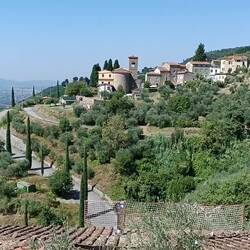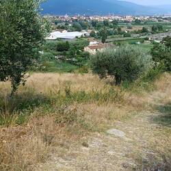 Das war wohl nichts mit Schlafen heute Nacht. Es war nicht nur sehr heiß, obwohl später eine kühle Brise von draußen kam, sondern immer, wenn ich gerade am Einschlafen war, hörte ich eine Mücke neben meinem Ohr. Grausam! Dann fand ich diese und erschlug sie, dachte, so, jetzt kann ich endlich schlafen, aber dann war da noch eine und noch eine-insgesamt erwischte ich sieben. Und als der Wecker eh 30 min später klingeln sollte, stand ich auf, die Mücke überlebte und ich gab auf. Um sechs war ich dann schon mit dem Bus in der Stadt zurück angekommen. Keine Bar hatte offen. Kaffee musste es irgendwann unterwegs geben. Der Weg ging am Fluss entlang und schließlich steil hoch, ich lief über den hässlichen Vororten. Wieder runter, an Olivenhainen vorbei, rauf zum nächsten alten Dorf mit Festung und runter -nach 10km endlich Kaffee und Croissant! Nochmal hoch und 20km Asphalt, also neue Blasen. Asphalt. Müde Füße. Und dann sah ich sie. Umgeben von Bergen, im Dunst der Sonne. Ist sie es wirklich? Ja! Da ist die Kathedrale, der Dom von Florenz! Mein Ziel, mein erstes Ziel sah ich da! Mir kamen die Tränen, ein sehr emotionaler Moment, der noch lange anhielt. Wie jemand, der wochenlang auf hoher See ist und dann Land sieht.
