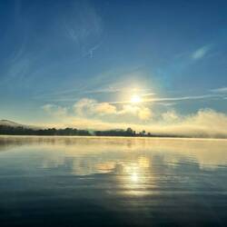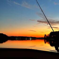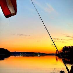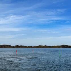 It was a little squirrely getting into this area. It is a windy shallow channel around sandbars. The area is beautiful with calm waters and no wind. There are lots of fish jumping. Unfortunately weLæs mere