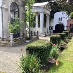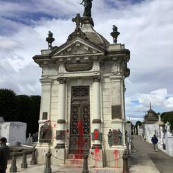 The building of fences created obstacles for the nomadic life of the Selk'nam people and introduction of sheep herds displaced their main food source, the guanaco. Facing starvation, they began to steal livestock. The Exploitation Society asked and received permission from the Chilean government to remove the indigenous population from the area. They did this by killing off most of the indigenous population. When we toured the cemetery the monument to the Menéndez had been painted in blood red due to the riots in Chile over wealthy owners of businesses and land.