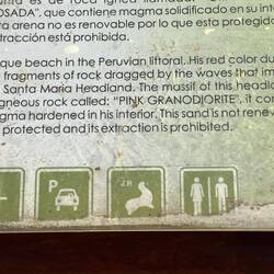 We were taken to several areas and in each area Olenka showed us something different. One of the areas we went to was a lookout where we saw a rock formation that used to be joined as a bridge with a hollowed out area in the middle. In 2007 there was a very bad earthquake in Peru registering 7.9 on the Richter scale. There were reports of lightning coming out of the ground. The bridge of the rock formation fell into the ocean and is no longer visible. The last area we saw was a red sand beach from the fragments of rock dragged by waves to the Santa Maria Headland. The rock is igneous rock called Pink Granodiorite, it contains magma hardened core from volcanos. The rock is of course, not renewable so it is protected and cannot be extracted from the area. Already some of the headland is being washed away by the waves and is falling into the ocean.