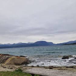 Auf dem Weg nach Narvik , klingelt unser Wecker um 7 Uhr. Vor unserem Balkon sehen wir eine Bergkette , teilweise Schnee bdeckt. Wir fahren durch den Ofotfjord um nach Narvik zu gelangen. DieLeer más