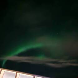 Der Lautsprecher in der Kabine lässt seinen Gong ertönen. Unser Kapitän wünscht uns einen guten Morgen, informiert uns über die Uhrzeit und sagt, " Sie können das Nordlicht direkt über unseremLeer más