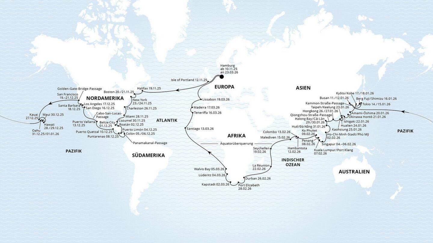 Dies ist die Route unserer Weltreise mit der AIDA Diva 2025/26.