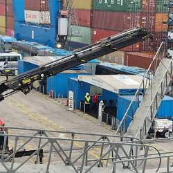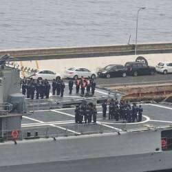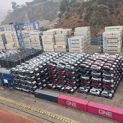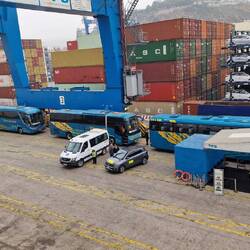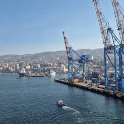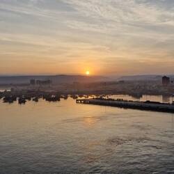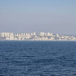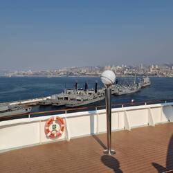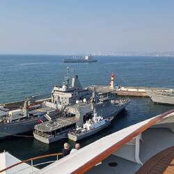 Sind jetzt bei recht diesigem Wetter eingelaufen. Rechts Militärflotte, links Autos und Container.