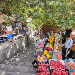 Am östlichen Ende plätschert ein Bach durch den Ort. Hier haben sich etliche Cafés angesiedelt, wo man gemütlich Tee trinken oder auch was essen kann. Wir haben uns einen Joghurtbecher mit frischen Früchten gegönnt.