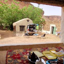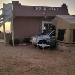 Da der Campground in der Stadt geschlossen war, sind wir zur Auberge de Jaafar gefahren, ca. 6 km außerhalb der Stadt. Im Dunkeln sind wir angekommen und mussten feststellen, dass alles dunkel war und es sehr verlassen aussah. Dann kam aber doch ein Mann mit Taschenlampe und erklärte uns, dass die Auberge und der Campingplatz eigentlich geschlossen sind. Alles wird gerade renoviert, und Wasser, Toiletten und Duschen gibt es auch nicht. War uns ja egal, uns so durften wir auf dem Gelände unser Lager aufschlagen.