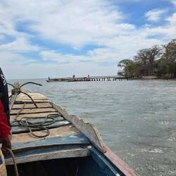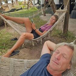 Geht auch nicht gut weiter. Auf der anderen Seite angekommen, empfängt Chris uns: " Gibt ein Problem. Mein Boot wurde versenkt." Nach einem lautstarken Wortgefecht mit den Dorfbewohnern beginnen wir, das Boot mit Eimern leer zu schöpfen. Geht auch ganz gut, und nach ca. 1 Stunde können wir mit dem Boot ins Camp fahren.