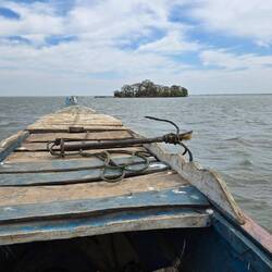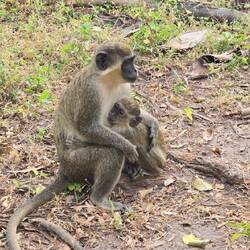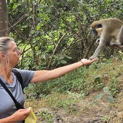 Mit Captain Hippo (der Name ist Programm) haben wir die Bootsfahrt zu den Inseln im Fluss gemacht. Auf drei der Inseln wurden Chimpansen angesiedelt, die zuvor aus illegaler Tierhaltung befreit wurden. Die Tiere leben dort in 4 Rudeln absolut unbehelligt auf den Inseln. Betreten ist strengstens verboten.