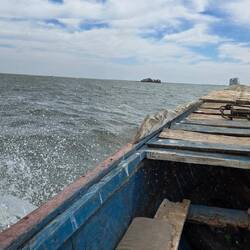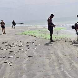 Auf dem Rückweg sehen wir einige Fischer. Vom Boot aus werfen sie parallel zum Ufer ein langes Netz aus und ziehen es dann an Land. 3 Mann ziehen links, 3 Mann rechts. An Land werden dann die Fische aus dem Netz geholt.