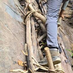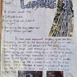 Also Leiter heißt hier: Stelle ein paar gerade Äste nebeneinander und binde sie alle 50 cm mit Lianen zusammen. Da kann man fein dran hoch klettern...