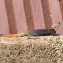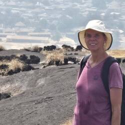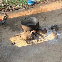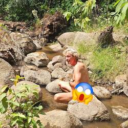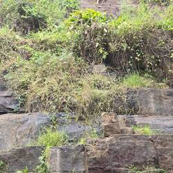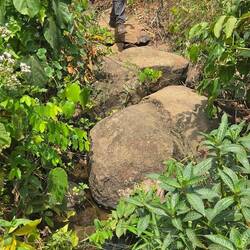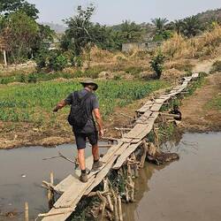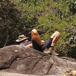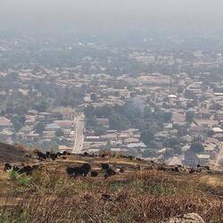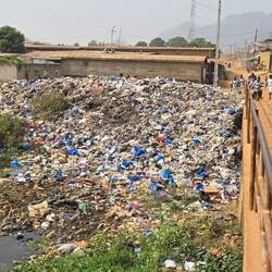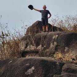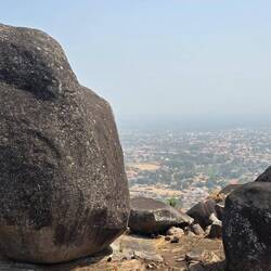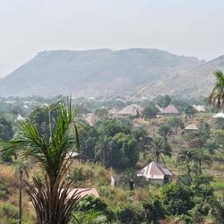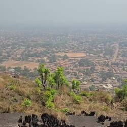 Unterwegs haben wir kaum Leute getroffen, nur 1x einige Arbeiter. Ein kleiner Bach lud zum Abkühlen im Wasser ein. Und zuletzt kam noch ein steiler Anstieg auf eine Felsenkuppe als kleine Herausforderung. Der Blick über die Stadt war leider getrübt: wie fast überall in Westafrika herrscht immer dicke Luft. Überall sieht man die Rauchwolken in die Höhe steigen.