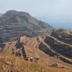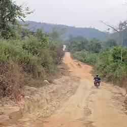 Gleich nachdem wir die Stadt verlassen hatten, begann schon die Sandpiste. Zuerst noch recht harmlos. Dann kam's aber mit aller Härte. Die Regenzeit hat metertiefe Furchen aus der Piste ausgewaschen. Unsere Fahrer mussten teilweise im Schritttempo durch Spurrinnen fahren und um Felsen herum zirkeln. Und nicht selten mussten wir absteigen, da es an den steilen Stellen zu zweit auf dem Moped unmöglich war da hoch oder auch runter zu kommen.