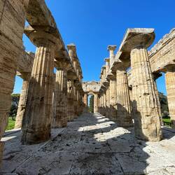 In Paestum steige ich aus. Hier erwartet mich ein kultureller Höhepunkt, auf den ich mich besonders freue: die historische griechische Siedlung aus dem 6. Jahrhundert vor Christus. Drei Tempel sind noch übrig, das Amphitheater, der Versammlungsplatz und die Grundmauern einst prächtiger Häuser. Der Ort kam durch Ackerbau und Handel zu Wohlstand. Die Stadt ist geprägt von Ordnung und geometrischen Formen. Doch dann übernahmen 273 v. Chr. die Römer die Stadt. Wie an vielen anderen Stellen der italienischen Küste versumpfte später auch hier die Gegend. Die Menschen zogen landeinwärts. Paestum geriet allmählich in Vergessenheit. Im 17. Jahrhundert wurde nichtsahnend eine Straße gebaut mitten durch das Amphitheater. Damit war der Ort wiederentdeckt, etwa zeitgleich mit Pompeji und Herculaneum, jenen Orten, die der Vesuv einst verschüttete.