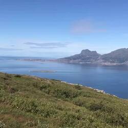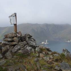 Da will ich nun hin! Tatsächlich finde ich die Treppe, sie scheint noch ganz neu zu sein. Natürlich regnet es, während ich das Storfjellet hinauf steige, und kalt ist es auch. Vier Schichten Kleidung - und auch Handschuhe - braucht es heute, doch am Gipfel sind zwei Lagen wieder im Rucksack verschwunden. So anstrengend ist es, die vielen Stufen hinauf zu steigen. Die Treppe hört auf, auf dem vermeintlichen Gipfel steht ein Briefkasten, der ein Gipfelbuch enthält. Doch das war nicht alles. Der eigentliche Gipfel scheint höher zu liegen. Gut, dass ich meine Trekking-Poles eingepackt habe, jetzt brauche ich sie, denn ab hier gibt es keine Treppe mehr. Über große und kleine Steine geht es weiter aufwärts. Doch auch die zweite Gipfelmarke scheint noch nicht das Ende zu sein. Drei weitere geschichtete Steinpyramiden erscheinen in einiger Entfernung vor mir im Dunst, zwischen dicken Regentropfen kaum auszumachen. Hinter mir: ein Regenbogen über der Bucht, schillernd in den schönsten Farben und auch das Meer gleist im hellsten Sonnenlicht. Ich nehm‘s als Zeichen. Weiter gehe ich nicht, drehe um und mache mich an den Abstieg. Der geht natürlich flotter und wird von Sonnenschein begleitet. Das Wetter ändert sich im Minutentakt.