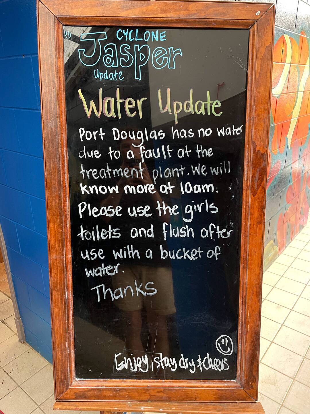 Aufgestanden und meine Sachen zum Duschen zusammengesucht, nur um dann herauszufinden, dass die Nachricht von gestern die Wahrheit ist. Wir haben jetzt auf unbestimmte Zeit kein Wasser mehr.