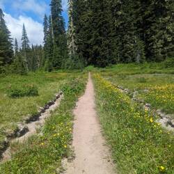The terrain Today was pretty. We had some last views of goat rocks, new views of Rainier, lakes and at the end we walked by white pass ski resort. Looks like a cool resort. Very old and great views of Rainier.