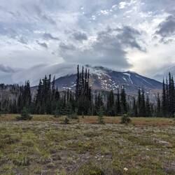 We got into trout lake around noon and met up with Ian and Riley who dropped off our resupply 💓 we got a delicious burrito at trout lake taco food cart. Ian drove us to the showers which were over at the park. Which was very nice because it's hot today! And we would have had to walk there in our rain gear 😅 it's gonna be a few weeks till I see them again so we great to get one last visit. We hung out at the general store for a few hours and caught the 5pm shuttle to the trail. There were 3 trucks filled with hikers. I counted 21 on the shuttle sign up sheet. We are officially in the biggest bubble yet. I ended up hiking 6.7 miles. We were in a burn zone so eventually found a large meadow to camp in with an epic view of Adams.