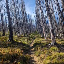 We are in the middle of a 20 mile water carry, so dry camping tonight for me! First long water carry in quite some time. I'm not complaining! I restarted Untamed by Glennon Doyle today. Such a good book! I'm sleeping in the middle of a big meadow tonight surrounded by burnt trees. The second half of today was through a burn zone so I was happy to find a safe camp spot! A gal I am camping with tonight (baby spice is her trail name) also has a doggo named Riley so we bonded quickly 🐾💓