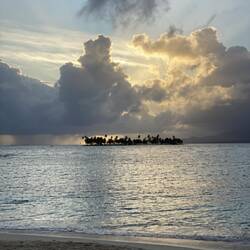 Trotz des Regens in der Nacht, gepaart mit ein paar netten Windböen, die auch vor unserer Hütte keinen halt gemacht haben, schaut die kleine Welt um uns herum am zweiten Morgen sehr friedlich und schön aus. Nach und nach treibt es die Inselianer aus ihren Hütten, um den Sonnenaufgang oder besser gesagt, dass was von dem Sonnenaufgang noch übrig ist zu beobachten. Es verspricht ein schöner Tag zu werden.