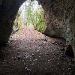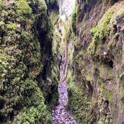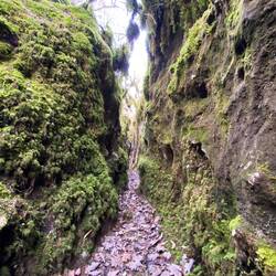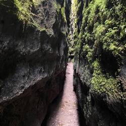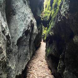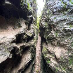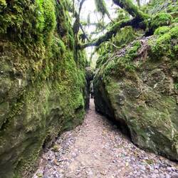 We marched through woods until the large rocks started appearing either side of us and then the ground started sloping down. Then the rocks formed walls and we realised we were in a canyon and it got tighter and narrower until we couldn’t walk any further. At this point we could have shimmied up the wall and into the next section but Ellie didn’t want to do that so we turned around and headed to the next canyon.