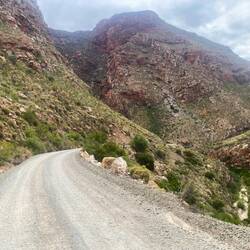 We left the supermarket just after 9am. We had a full day of driving ahead of us today and I wanted to get the first but over with quite early to avoid any hold ups so we set the sat nav and drove back in the direction of the canto caves but just before we got to them we turned left heading for the swartbergpass. 10 miles later there was a sign saying the tarmac was ending and before we knew it we were onto a gravel track that narrowed into just wider than a single lane and started climbing.