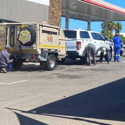 After a couple of coffees we gradually started packing things away. We really took our time. We took the Sun Tarp off and laid it on the floor for 20 minutes to dry and this also allowed any condensation to dry on the awning. Slowly things were put away for the last time, our clothes went into a storage box and we loaded the cases and at 11am we left Onrus camp for the last time and drove 2 miles down the road to the car wash where I had pre arranged to wash the car and caravan on Saturday. While the car was being washed we walked down to the row of shops and had fish and chips for breakfast At 12:15pm the car was done, they had done an amazing job getting all of the dirt and sand from the trip from the underneath.
