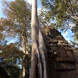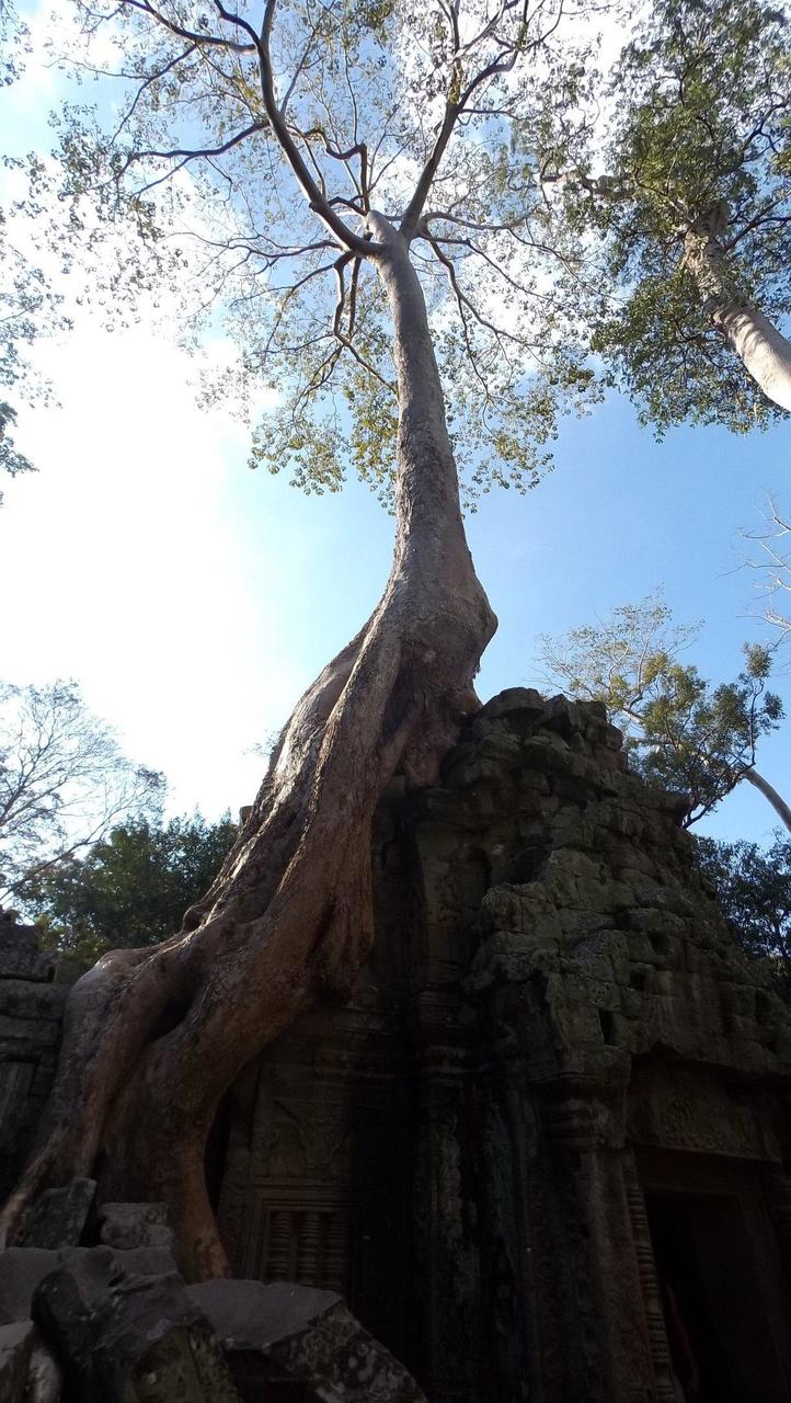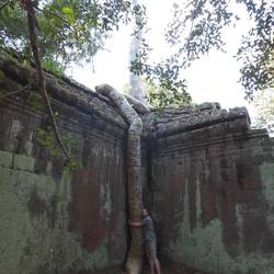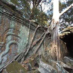 La nature reprend ses droits, arbres grandioses d'une hauteur vertigineuse, dont les racines s'immisçant entre les pierres des temples, remodèlent l'architecture à leur manière.