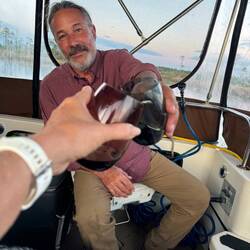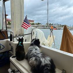 At anchor at the mouth of the Caloosahatchee River after logging 35.8 miles. Animals are settling into boat life nicely. Tomorrow we head east.