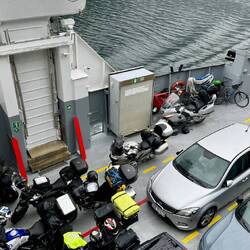 Wir reisten mit der Fähre von Dänemark nach Norwegen und buchten die Tickets im Voraus (eineinhalb Monate vorher) - 100 Euro für zwei Personen und ein Motorrad, plus 55Læs mere