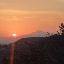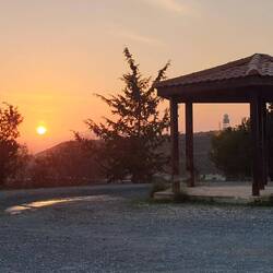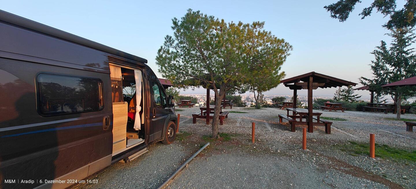 Von hier oben genießt man einen herrlichen Ausblick über Larnaca bis zum Meer. Heute hatten wir einen wunderschönen Sonnenuntergang und nachts funkeln die Lichter der Stadt.