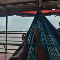 Carl (un chico inglés que conocimos en Leticia), Curtis y yo llegamos con mucha anticipación para asegurarnos un buen lugar. Al llegar no había nadie 🤣 así que pudimos colgar nuestras cosas sin problemas. Después llegaron 4 alemanes y quedamos todos juntos en la misma zona del barco. Nosotros 7 seríamos los únicos turistas, los demás eran todos del amazonas.