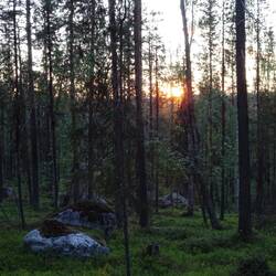 Nach 23 Uhr machen wir uns mit frischen Erdbeeren und heißem Tee auf den Weg nach oben. Je höher wir kommen, desto mehr Sonne sehen wir in den Baumwipfeln über uns, bis wir selbst wieder in derLæs mere