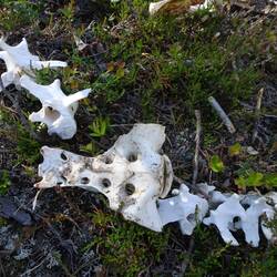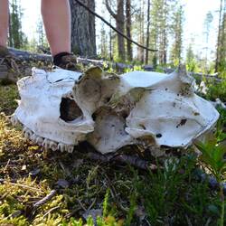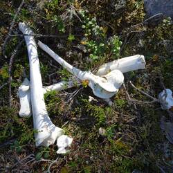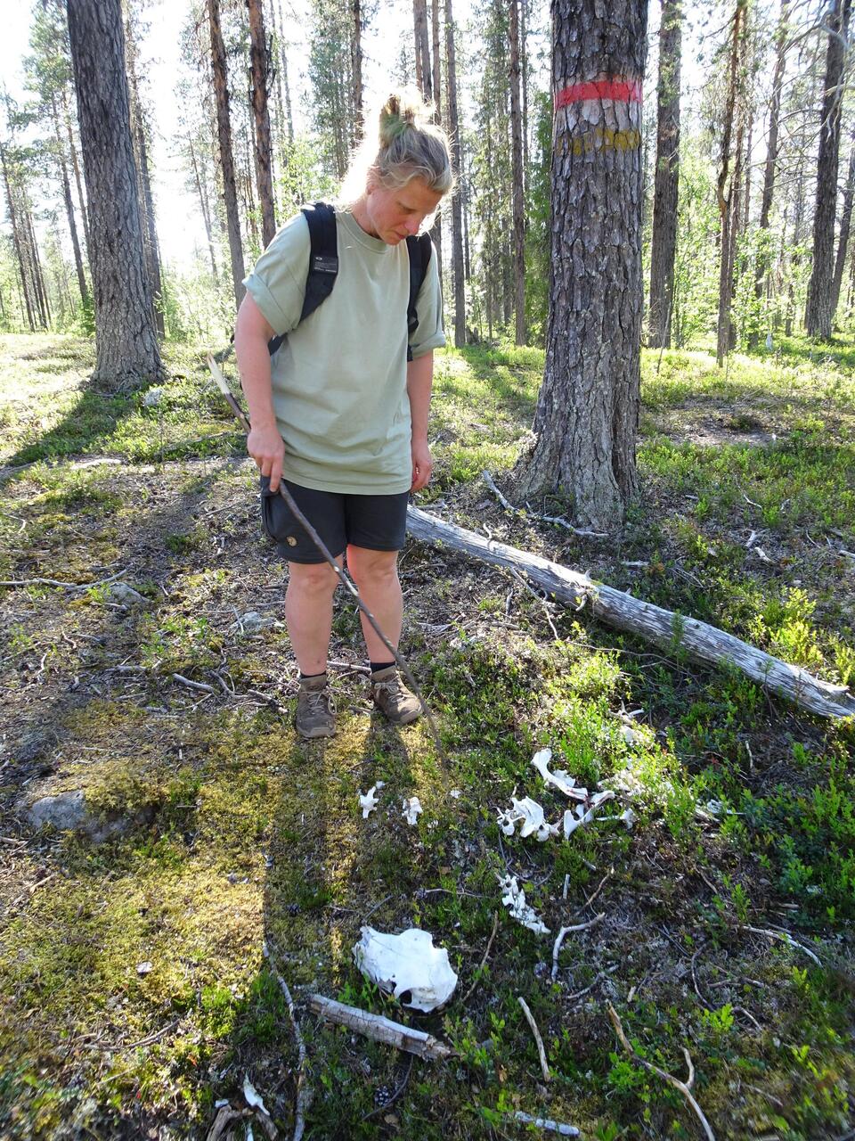 Knochenforscherin Nicole findet Überreste von einem, so glauben wir, Rentier. Vielleicht wurde es von einem Luchs gerissen, solche leben nämlich hier. Etwas später läuft mir ein hübscher VogelLæs mere