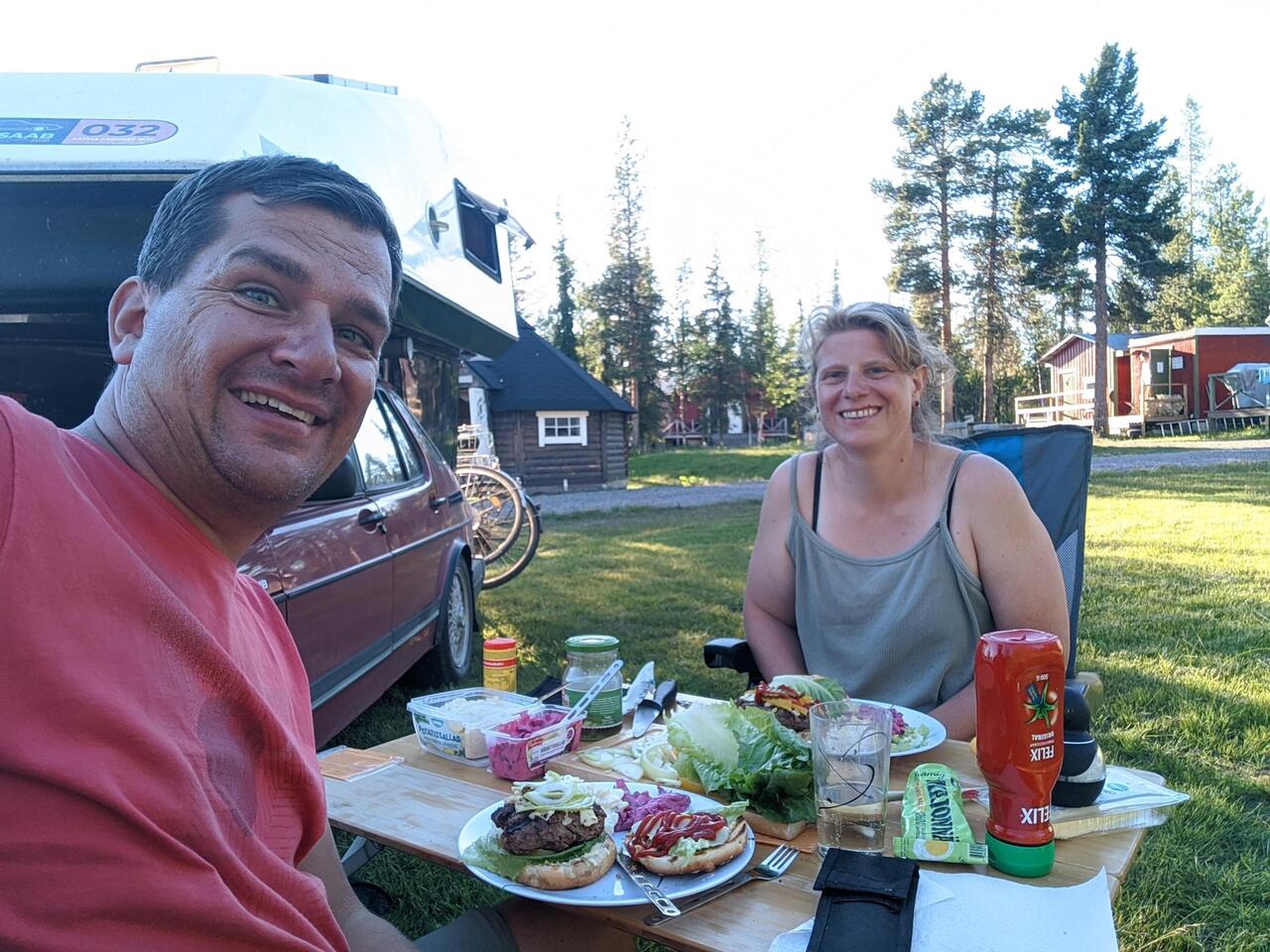 Kurz vor Kiruna finden wir einen der schönsten Campingplätze der bisherigen Reise: Nett, sympathisch, familiär, preiswert und toll am See gelegen. Für's Abendessen grillen wir Burger, danachLæs mere