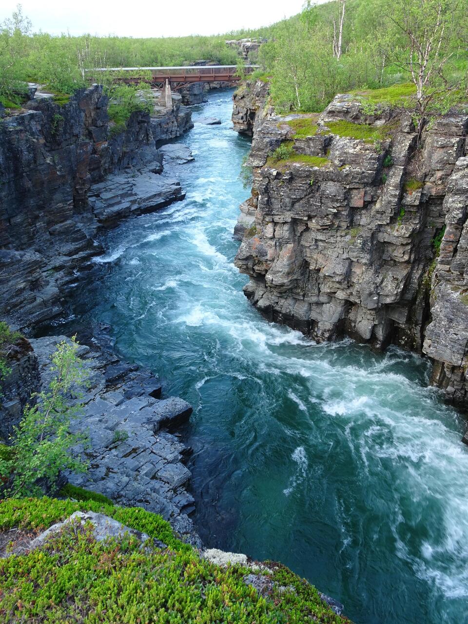Abends kommen wir im Abisko-Nationalpark an. Weil wir fit sind und das Wetter gut, besichtigen wir noch die leicht zugängliche Schlucht.