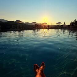 Heute genießen wir dieses kleine Paradies! Ich mache den ganzen Tag genau das, was die Dame auf dem Bogen im Pool macht. 😀